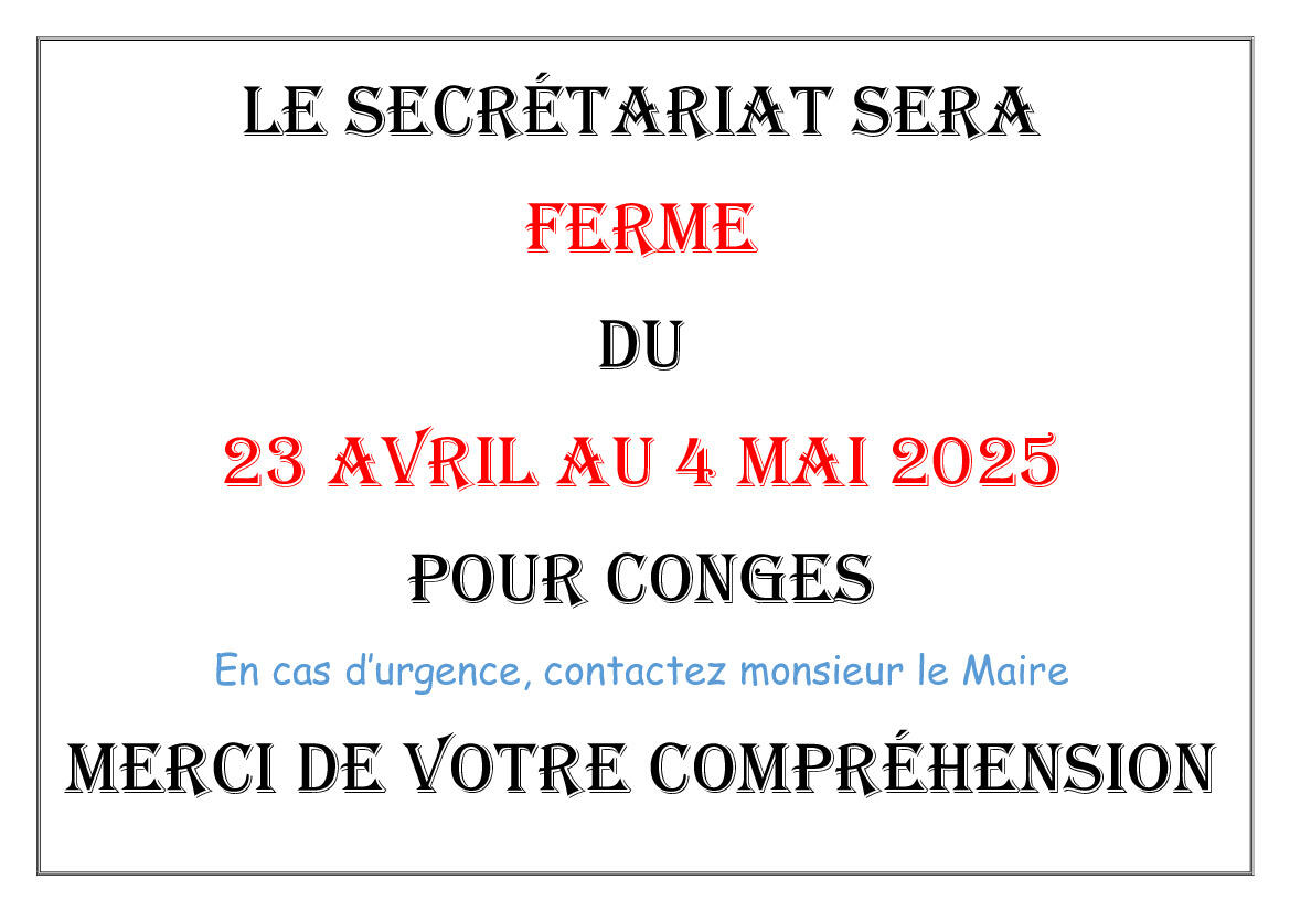 Your town hall / News / fermeture secrétariat du 23/04 au 4/05