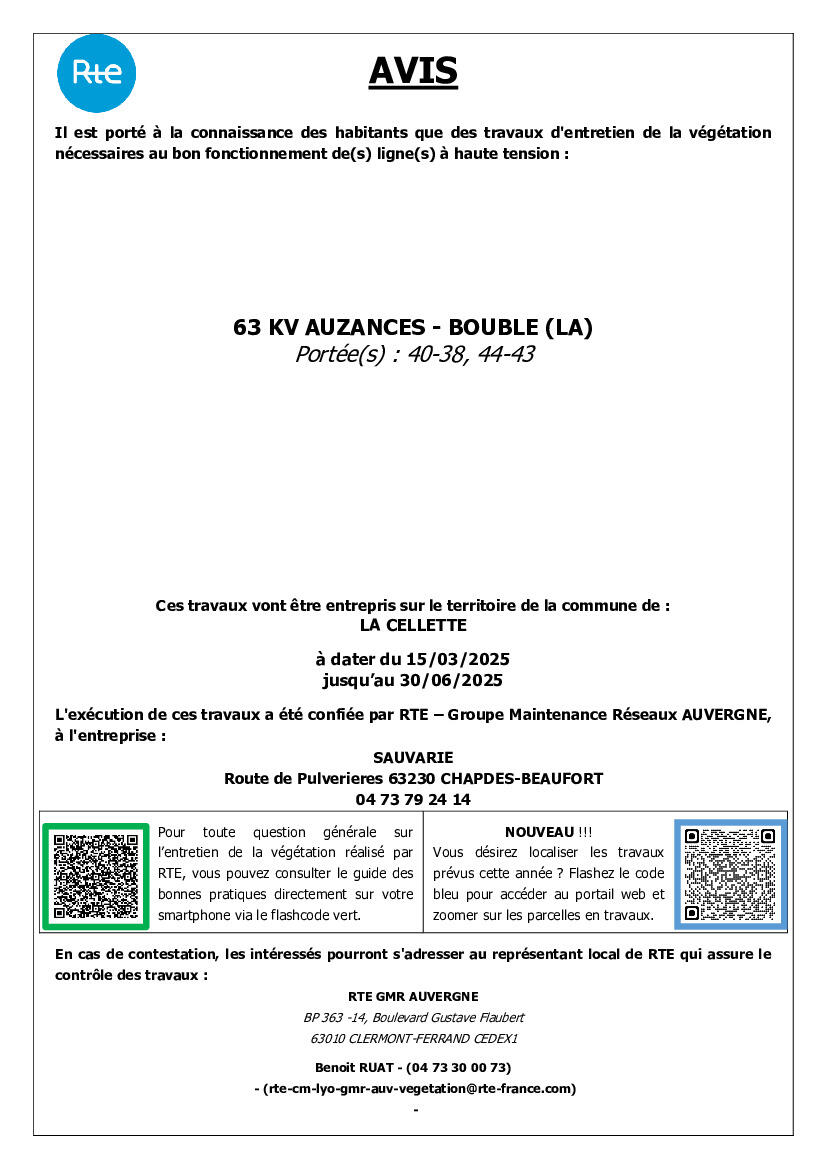 Réseau Transport Electricité (RTE)  va prochainement faire réaliser des travaux d'élagage et d'abattage sur le territoire de la commune, afin d'assurer le bon fonctionnement des lignes hautes tension mais également la sécurité des personnes aux abords de ces ouvrages.