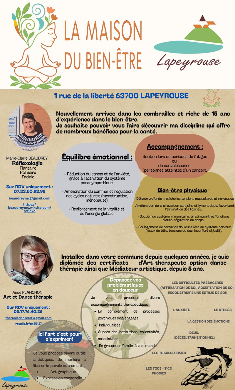 à l’espace « La maison du Bien-Être » de Lapeyrouse situé au 1 rue de la liberté à Lapeyrouse. (bâtiment de l’école)