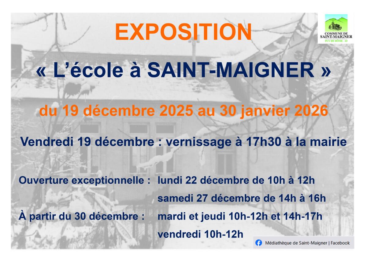La Mairie de Saint-Maigner et les bénévoles de la Médiathèque vous proposent une exposition retraçant la vie à l'école à Saint-Maigner à la Mairie du 19 décembre 2025 au 30 janvier 2026.