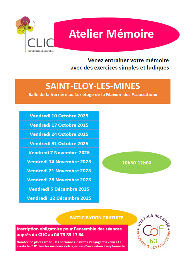 Participation gratuite/ inscription obligatoire pour l’ensemble des séances auprès du CLIC au 04 73 33 17 64.
