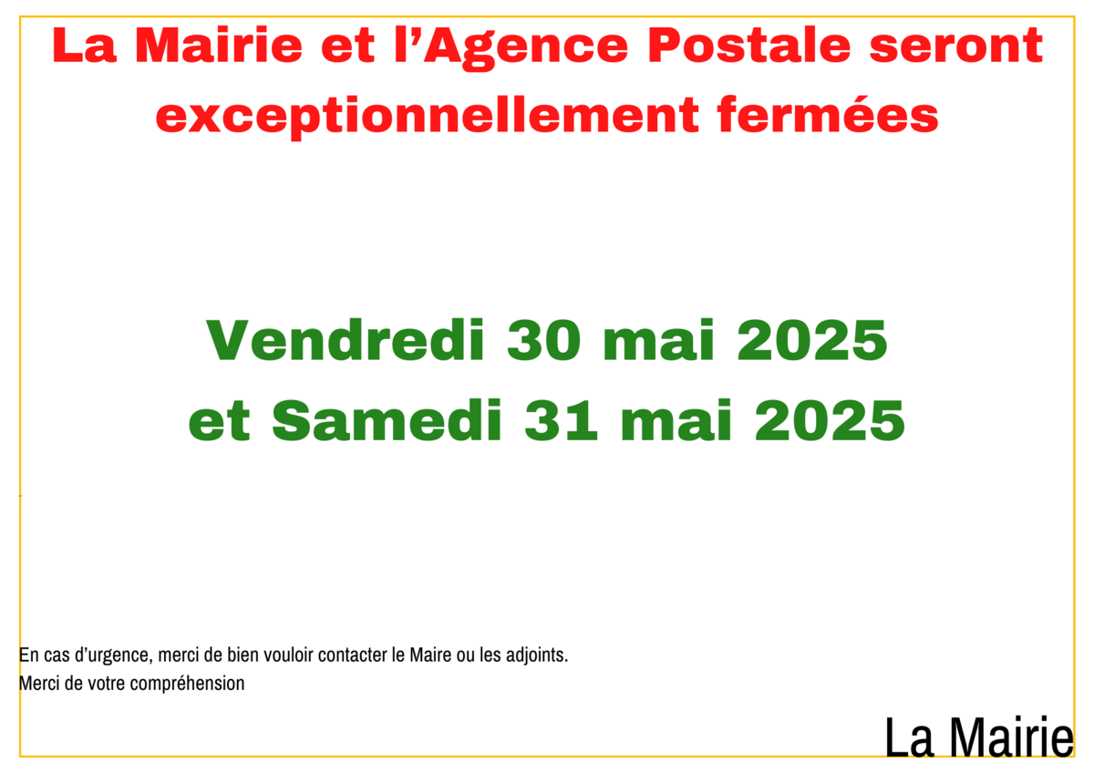 La Mairie et l'agence postale seront fermées le Vendredi 30 mai et Samedi 31 mai 2025.