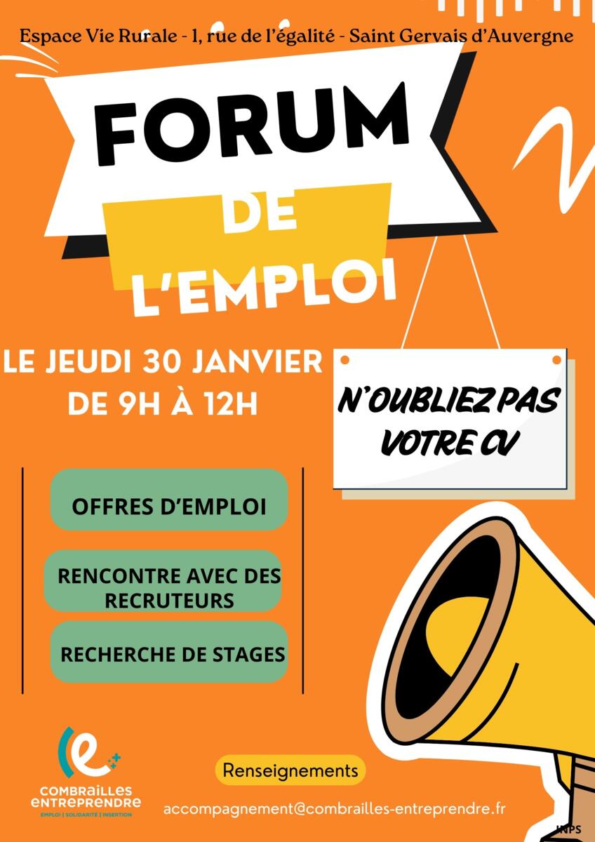 L'association Combrailles Entreprendre organise un forum de l'emploi le jeudi 30 janvier 2025 de 09 h 00 à 12 h 00 à l'espace de vie rurale de Saint-Gervais d'Auvergne. La manifestation s'adresse au employeurs et personnes en recherche d'emploi.