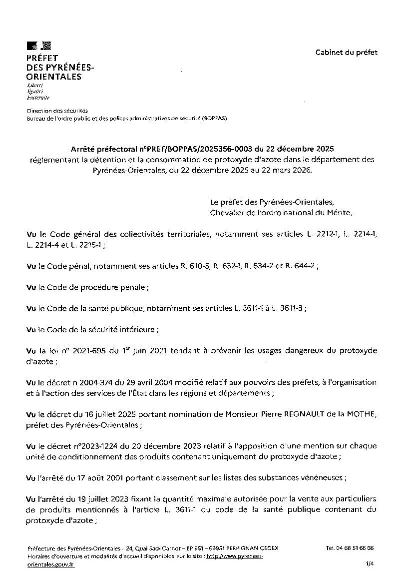 Veuillez trouver l'arrêté préfectoral réglementant la détention et la consommation de protoxyde d'azote dans le département des Pyrénées-Orientales, du 22 décembre 2025 au 22 mars 2026.