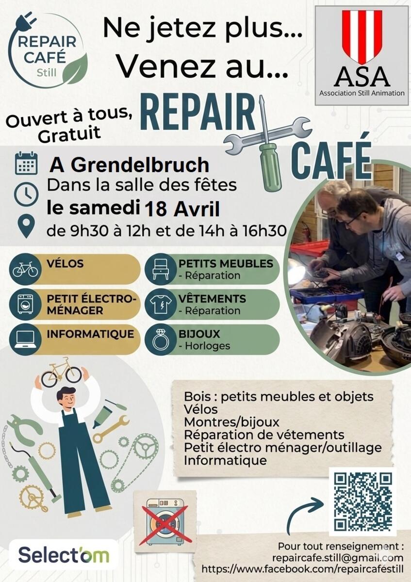 Repair Café 3/23/26 Repair Café à Grendelbruch samedi 18 avril 2026 de 9H30 à 12 H et de 14H à 16H30 Salle des Fêtes