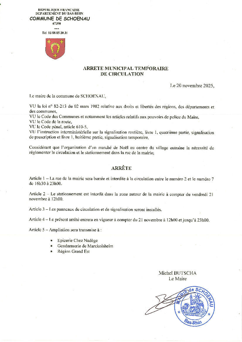 Nous vous adressons, l’arrêté de circulation et de stationnement pris dans le cadre de l’organisation du marche de Noël organisé ce vendredi 21 novembre dans le centre du village.