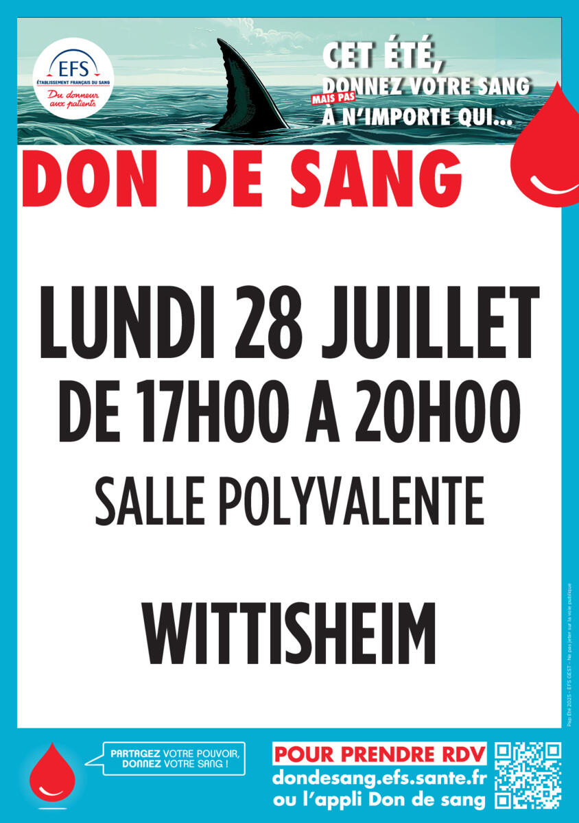 DON DU SANG 6/25/25 DON DU SANG 📆 LUNDI 28 JUILLET 2025 ⏰DE 17H00 à 20H00 Salle polyvalente de Wittisheim