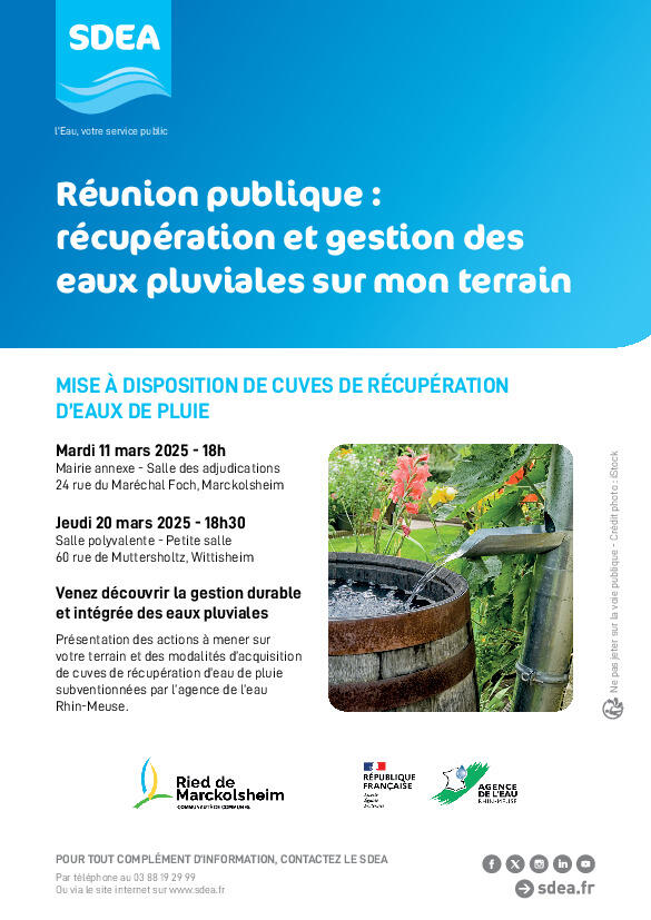 Le Syndicat des Eaux et de l’Assainissement Alsace-Moselle (SDEA), en partenariat avec l’agence de l’eau Rhin-Meuse, lance à partir de mars 2025 et pour une durée de 3 ans, une opération de déraccordement et de mise à disposition de cuves de récupération des eaux de pluie à destination des habitants de la Communauté de Communes du Ried de Marckolsheim.