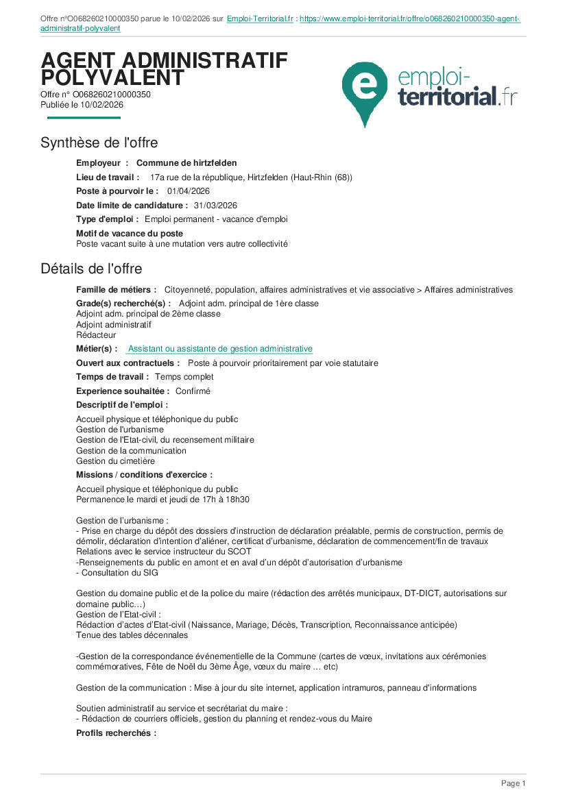 Mairie d'Hirtzfelden : offre d'emploi