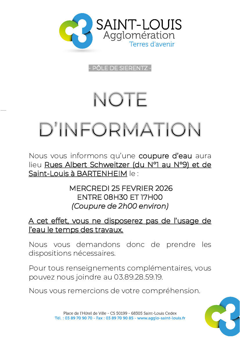 Nous vous informons d’une fuite d’eau sur branchement rue Albert Schweitzer à Bartenheim.
