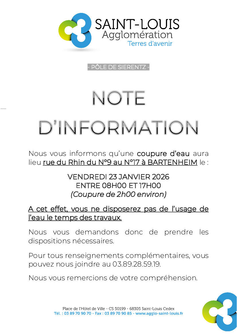 Coupure d'eau rue du Rhin le vendredi 23 janvier