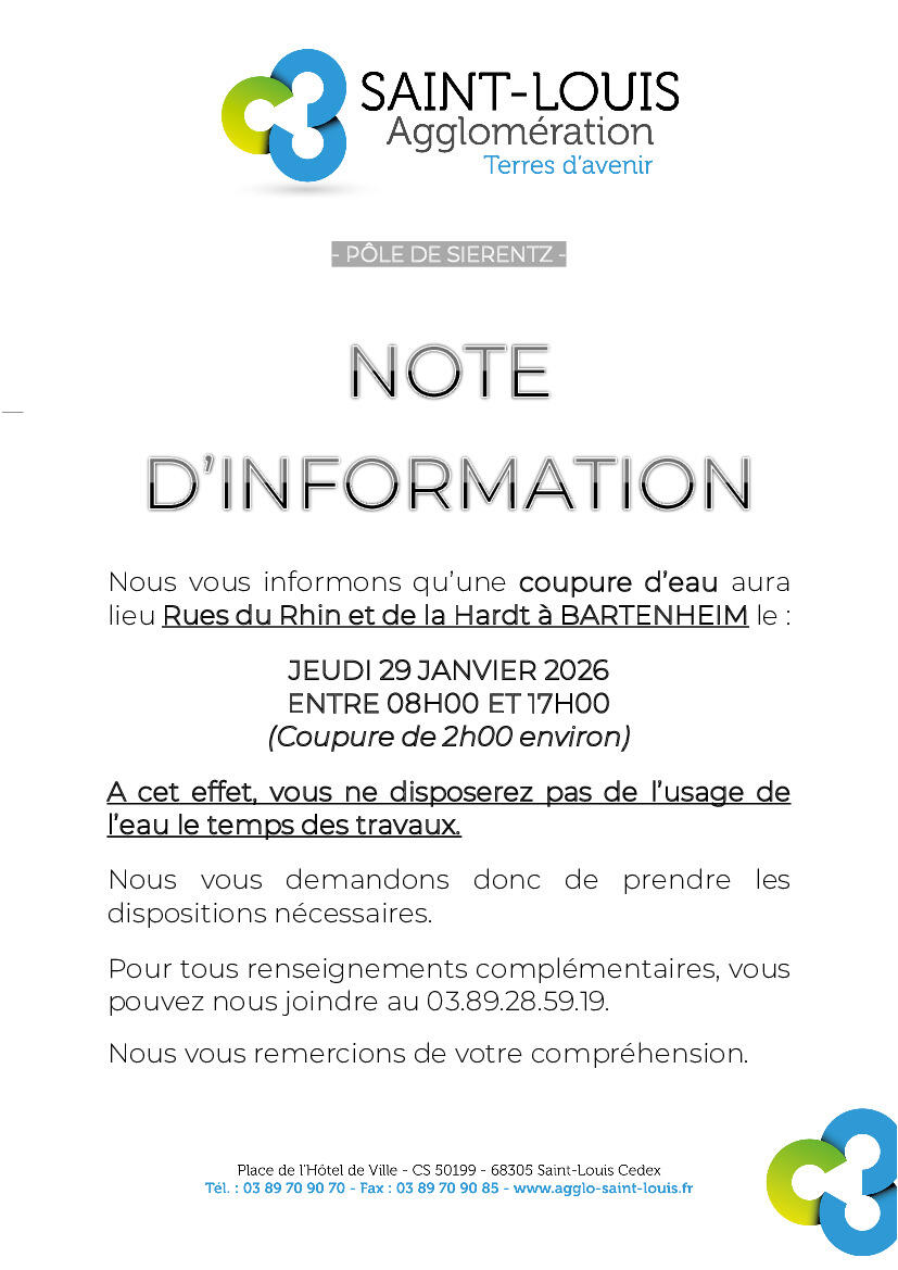 Nous vous informons d’une fuite d’eau sur branchement rue du Rhin à BARTENHEIM LA CHAUSSEE.