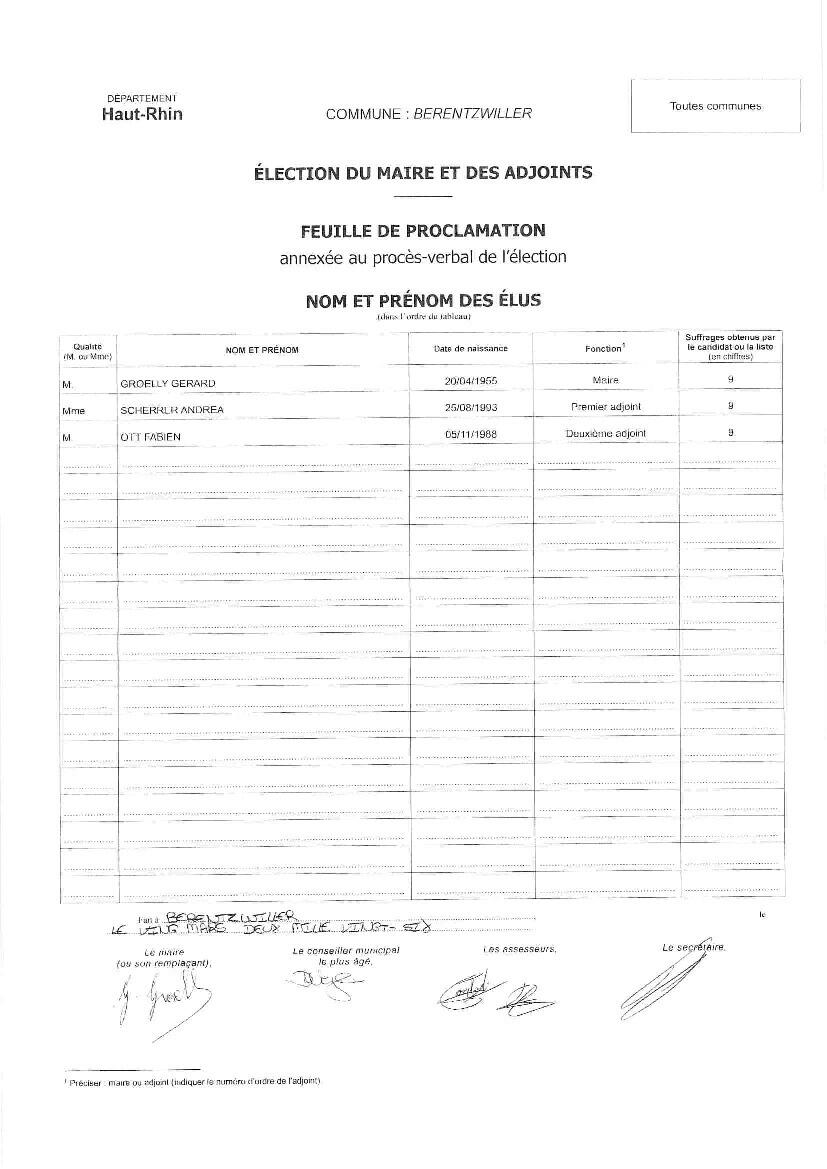Vous trouverez ci-joint le tableau du conseil ainsi que la feuille de proclamation du Maire et des adjoints. Ces documents sont le reflet de votre vote et marquent le début de notre engagement au service de tous.