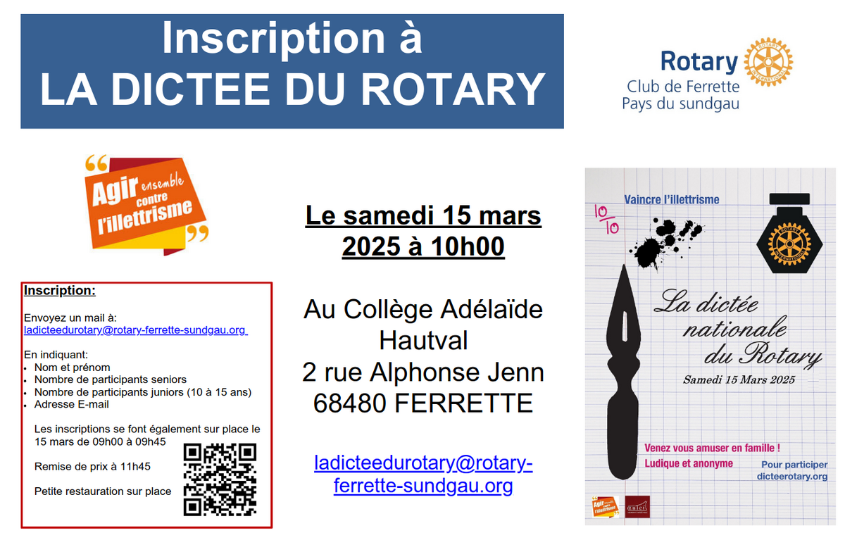 Le Rotary Club de Ferrette - Pays du Sundgau organise une dictée solidaire le **samedi 15 mars** au collège Adélaïde-Hautval de Ferrette. Cet événement, ouvert à tous, vise à sensibiliser à l'illettrisme et à collecter des fonds au profit d’élèves en situation de handicap de l’ULIS du collège de Ferrette.