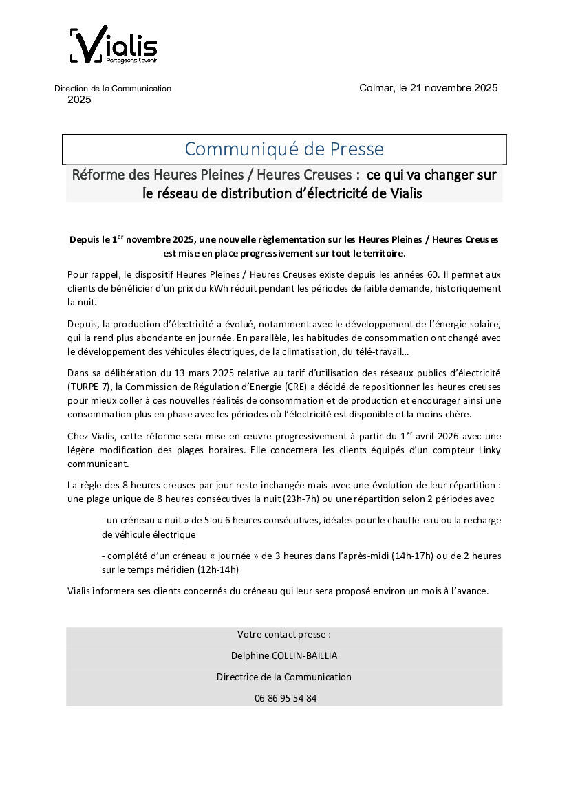 Communiqué de presse Vialis - Heures Pleines / Creuses