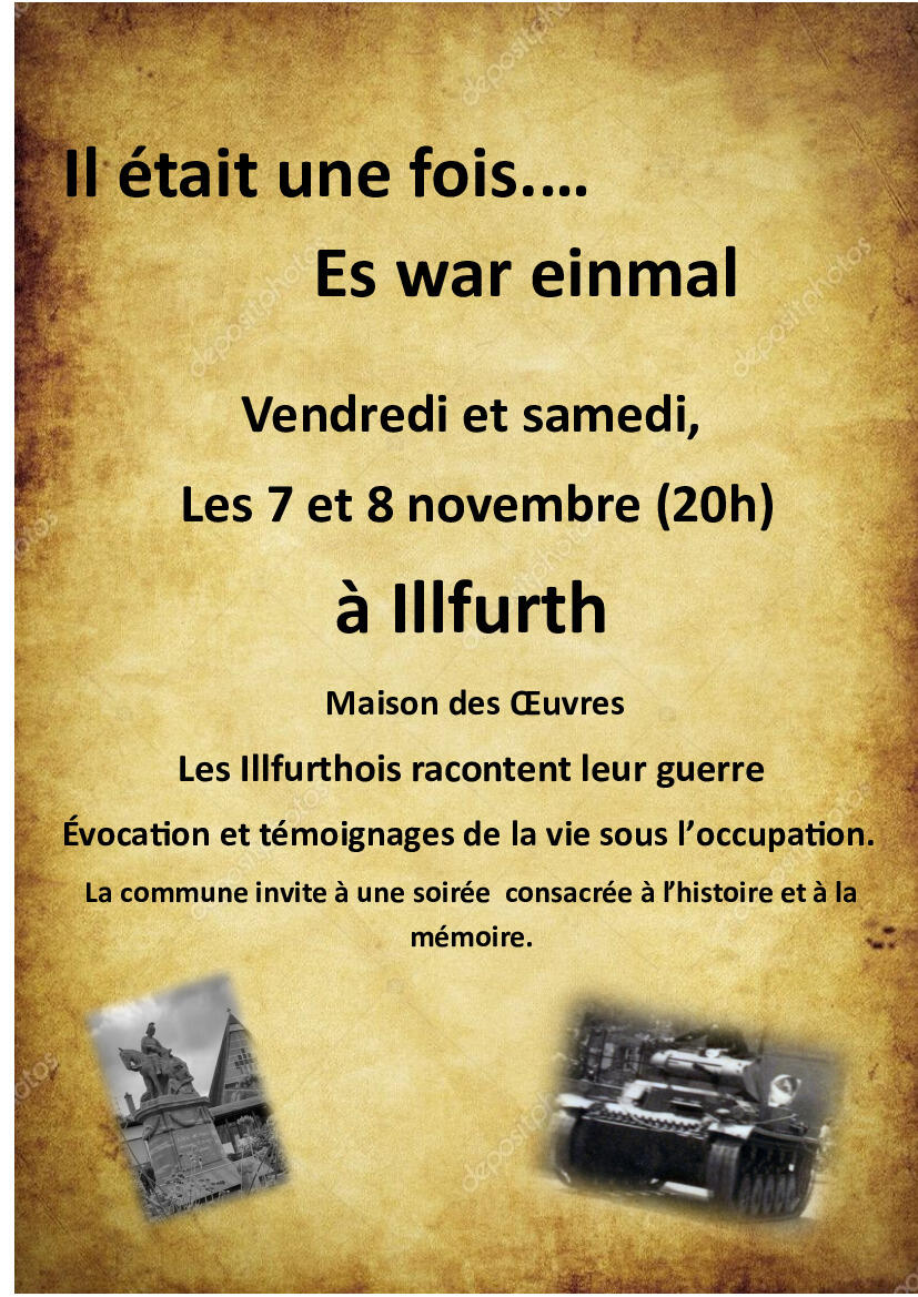 Sous la forme d'une veillée, la commune propose le vendredi 7 et samedi 8 novembre, à 20h00, à la Maison des OEuvres une évocation de la vie d'Illfurth pendant l'occupation et lors de la libération.
