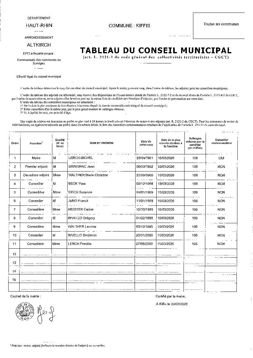 Vous trouverez ci-joint le tableau du Conseil municipal ainsi que la feuille de proclamation du Maire et des adjoints. Ces documents reflètent votre vote et marquent le début de notre engagement au service de tous.