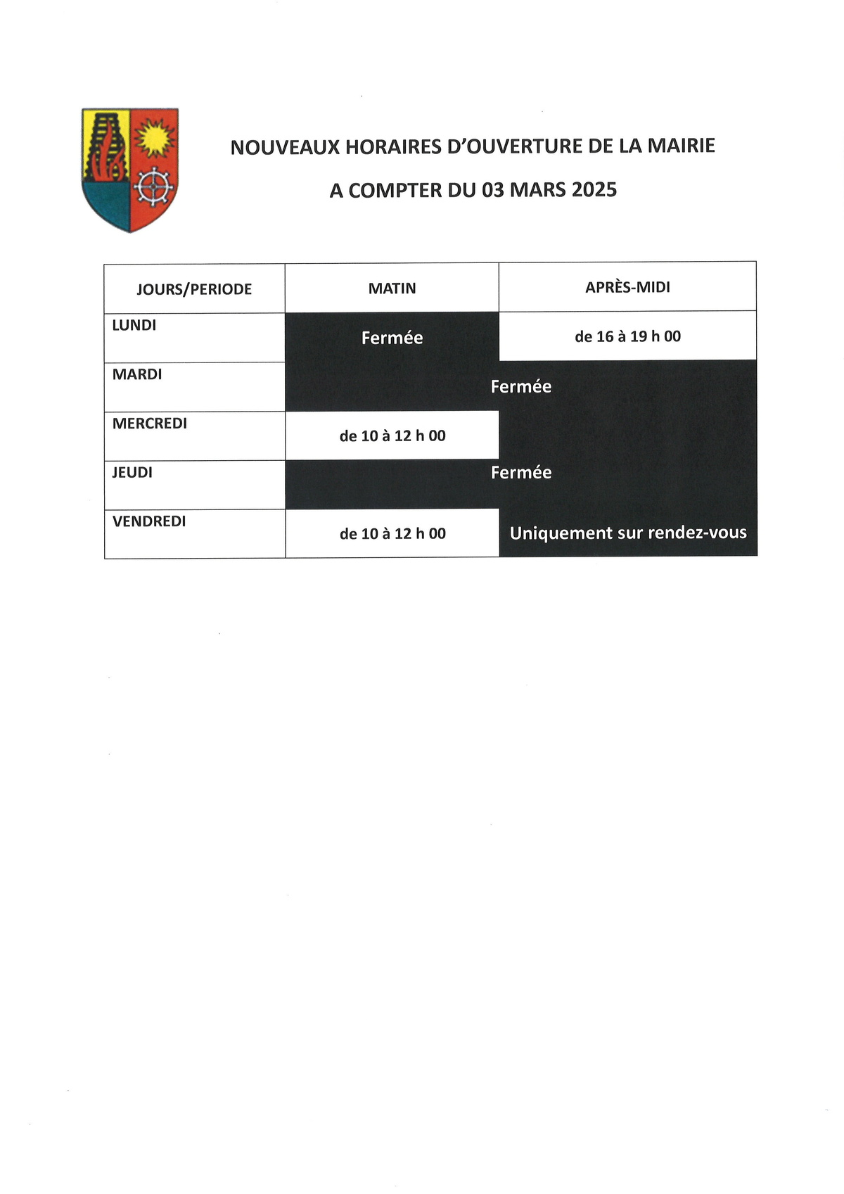 NOUVEAUX HORAIRES D'OUVERTURE DE LA MAIRIE 2/24/25 A COMPTER DU 03 MARS 2025, les horaires d'ouverture au public changent