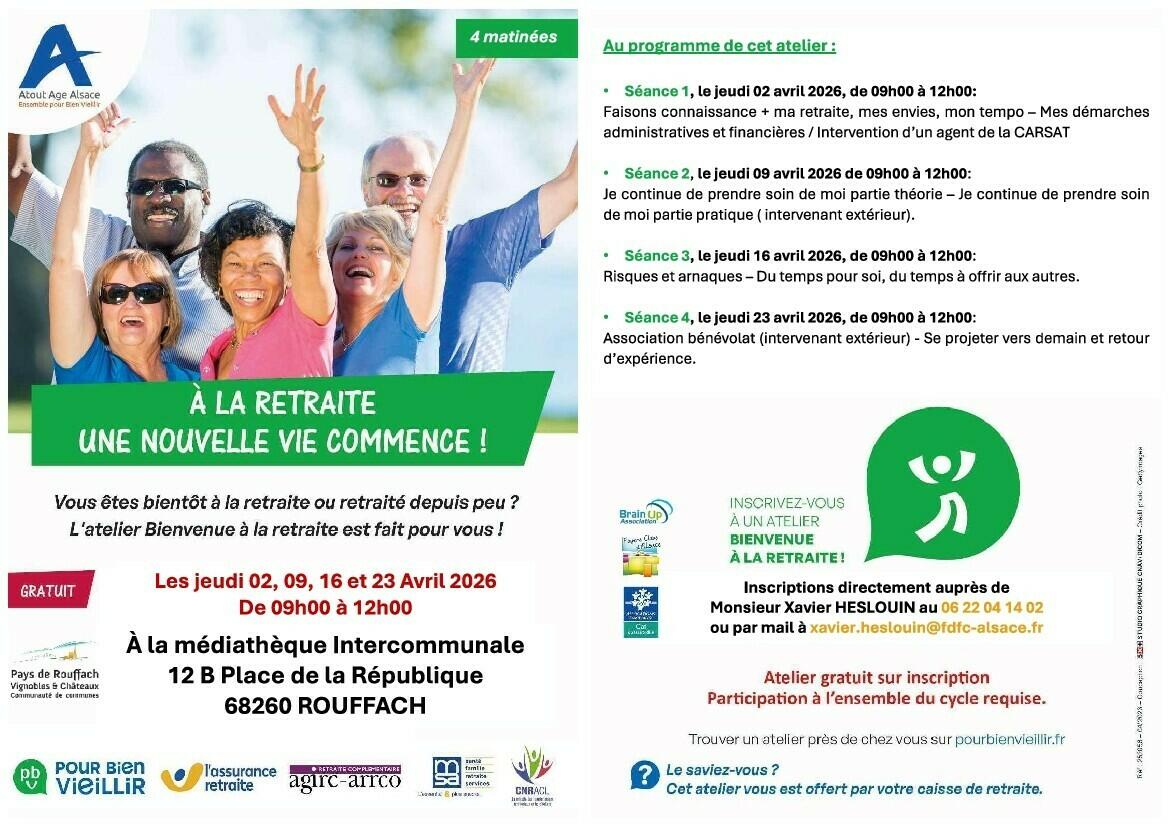 Bienvenue à la Retraite 3/10/26 Vous êtes ou vous serez bientôt à la retraite, 4 ateliers vous sont proposés