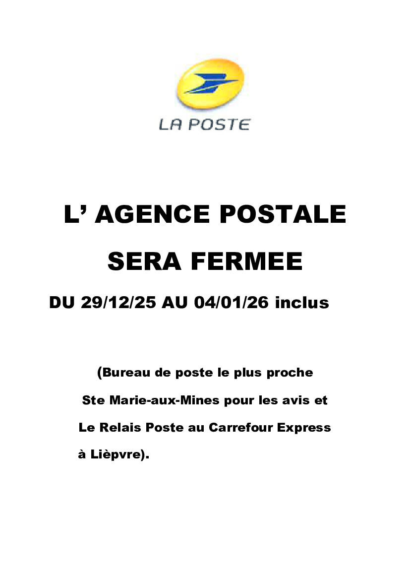 L’Agence Postale Communale sera fermée du lundi 29 décembre 2025 au dimanche 4 janvier 2026