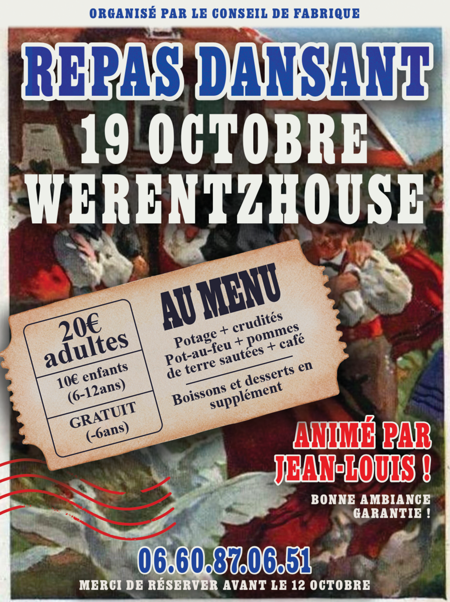 Le Conseil de Fabrique organise un repas dansant le dimanche 19 octobre à midi à la salle polyvalente de Werentzhouse.😍