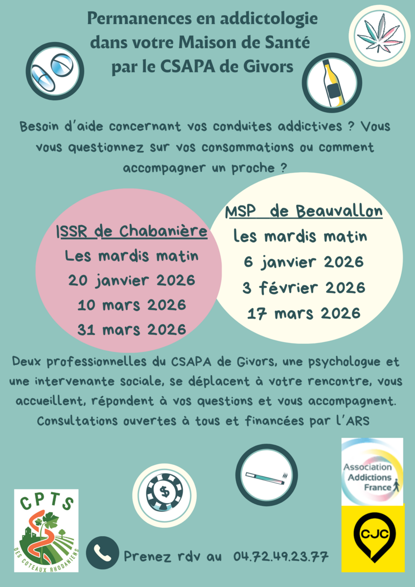 La Communauté Professionnelle Territoriale de Santé (CPTS) des coteaux rhodaniens organise avec le Centre de Soins, d'Accompagnement et de Prévention en Addictologie (CSAPA) de Givors, des permanences en addictologie sur notre territoire.