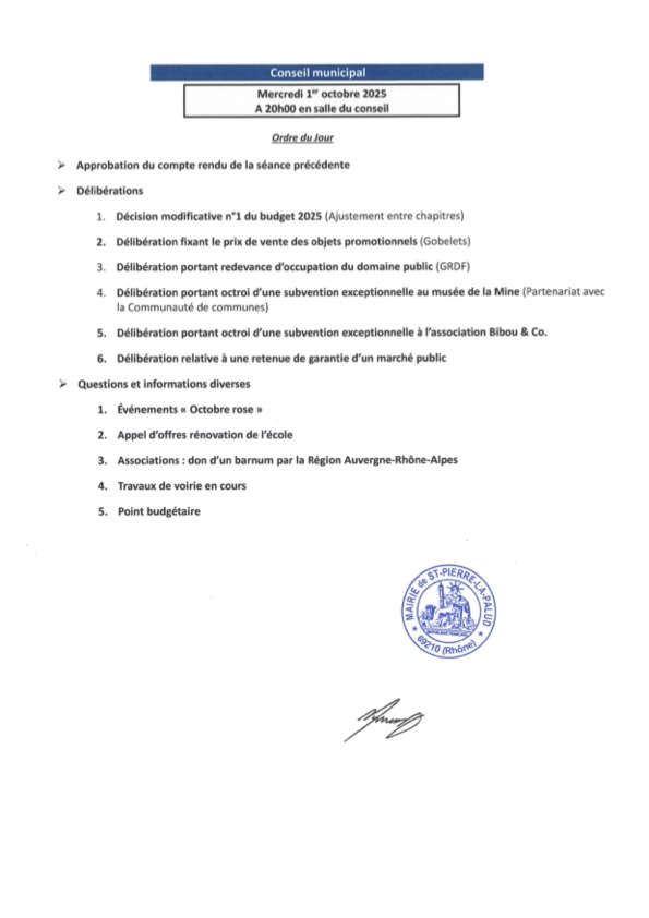 Le prochain conseil municipal aura lieu le mercredi 1er Octobre à 20H