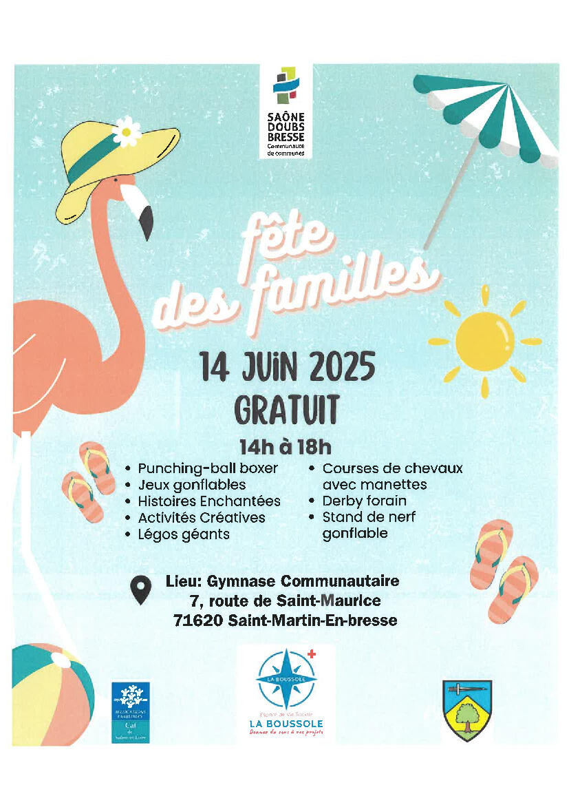 La Communauté de communes Saône Doubs Bresse organise une fête des familles le 14 juin 2025 au gymnase communautaire de St Martin en Bresse.
