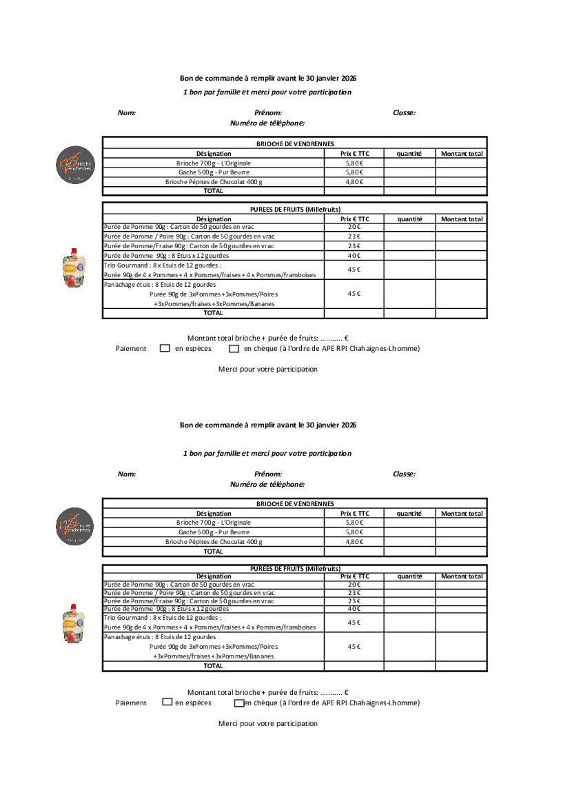 Pour bien commencer 2026, nous lançons notre première vente de l’année : brioches (brioche de Vendrennes 85) et purées de fruits (en gourdes avec Millefruits 49) sont à l’honneur ! Vous trouverez le bon de commande avec ce mot, 1 bon par famille, commande avant le 30 janvier 2026.