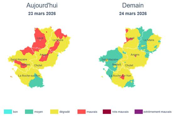 A l'exception du sud de la Vendée, la qualité de l'air demeure aujourd'hui dégradée sur une large partie du territoire ligérien, en raison de concentrations élevées en particules fines PM2.5. Elle est même mauvaise sur plusieurs secteurs de la région. Une amélioration est attendue à partir de demain, avec un changement de secteurs des vents. Néanmoins, les concentrations en ozone pourraient augmenter à compter de mercredi.