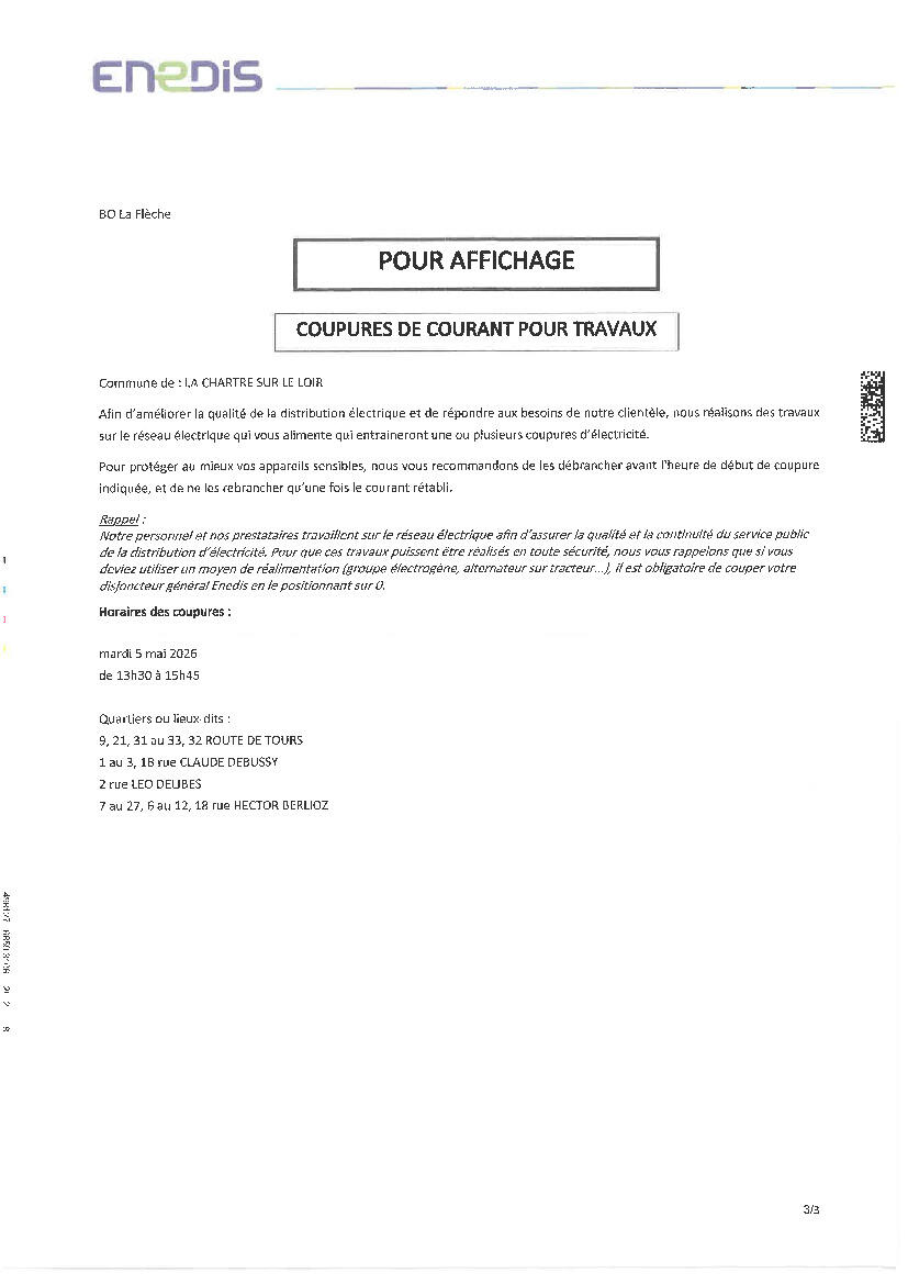 Avis de coupure de la part d'ENEDIS pour le mardi 5 mai 2026 entre 13h30 et 15h45.