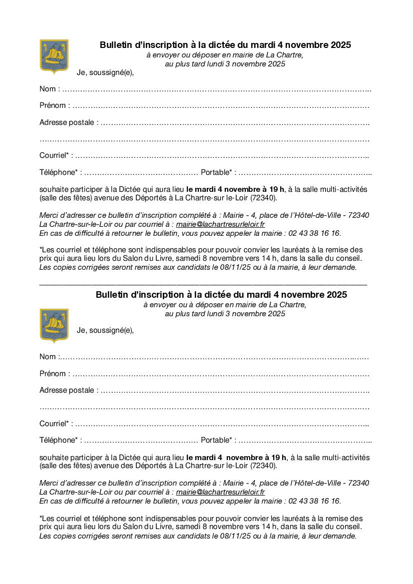 Le bulletin d’inscription est à envoyer ou déposer en mairie au plus tard le lundi 3 novembre 2025.