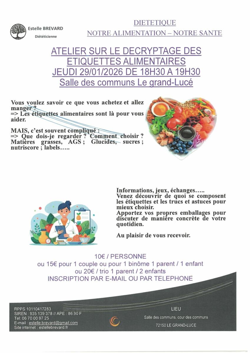 Atelier sur le décryptage des étiquettes alimentaires : Jeudi 29 Janvier 2026 de 18h30 à 19h30 Salle des Communs.