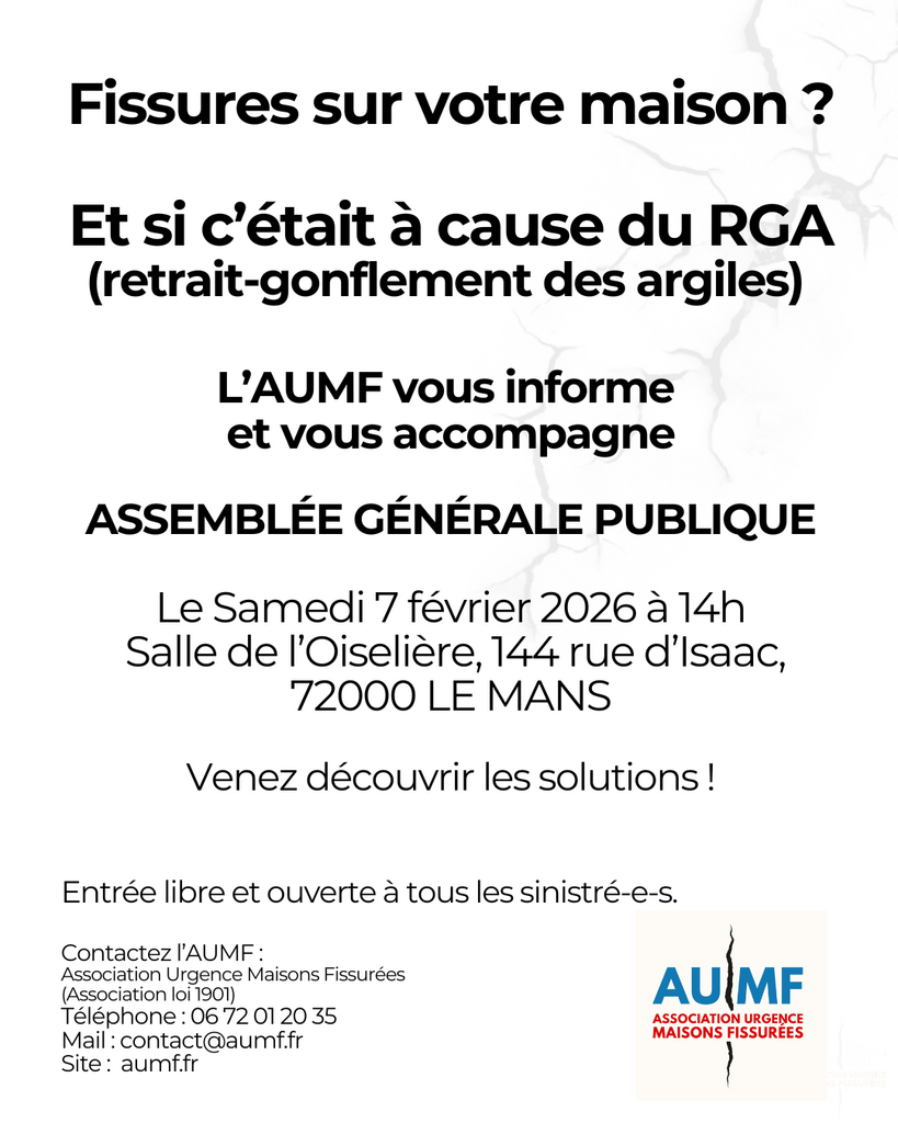 L’AUMF (Association Urgence Maisons Fissurées) organise son Assemblée Générale Ordinaire publique pour informer et accompagner les sinistrés de votre territoire :