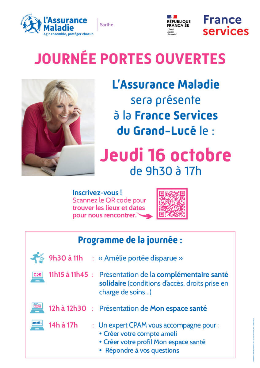 Porte ouverte de l'assurance maladie qui se déroulera le jeudi 16 octobre de 9h30 à 17h au France Services (au Centre Social) du Grand Lucé.