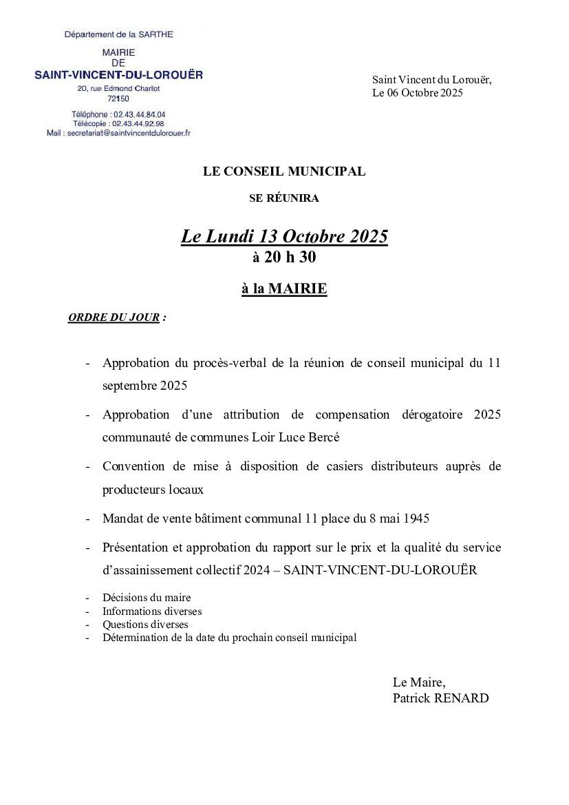 CONSEIL MUNICIPAL DU 13 OCTOBRE 2025 10/7/25 Conseil Municipal du Lundi 13 Octobre à 20h30 à la mairie. Source : Mairie de Saint-Vincent-du-Lorouër