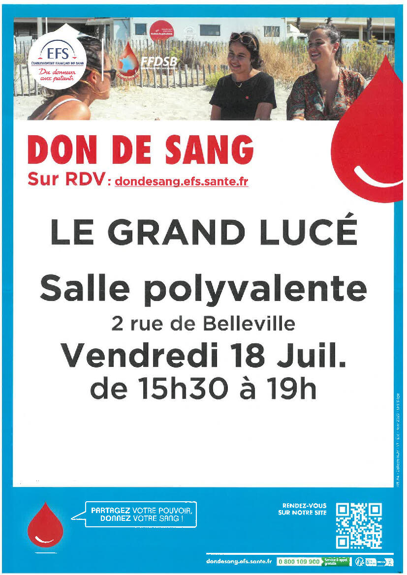 Don du sang au Grand-Lucé - Vendredi 18 Juillet 6/27/25 👨⚕️ Don du Sang au Grand-Lucé 📍 Salle Belleville 🕝 De 15h30 à 19h Source : Mairie de Montreuil-le-Henri
