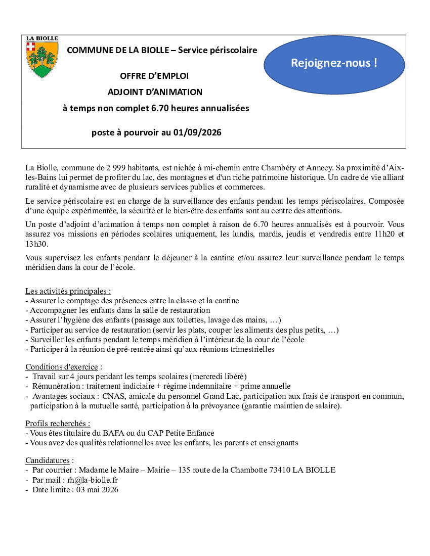 La mairie de La Biolle recrute ! Adjoint(e) d’Animation