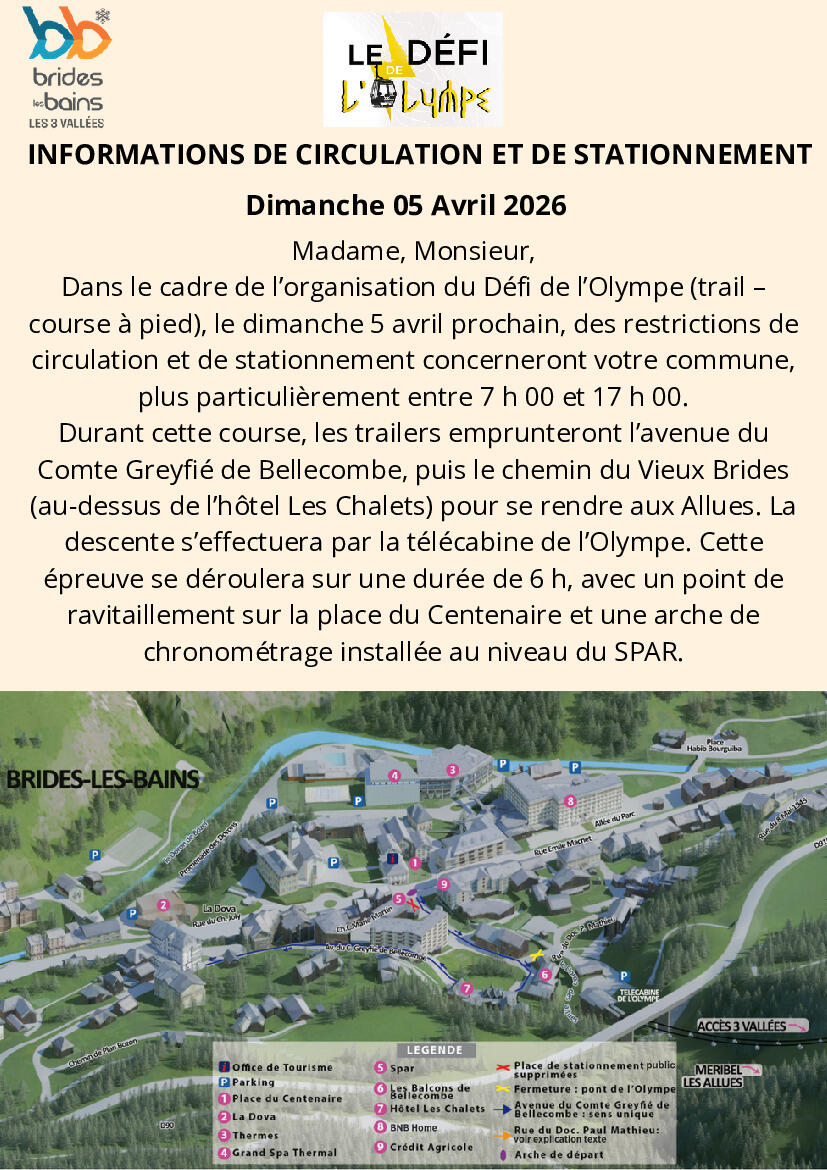 Dans le cadre de l’organisation du Défi de l’Olympe (trail – course à pied), le dimanche 5 avril prochain, des restrictions de circulation et de stationnement concerneront votre commune, plus particulièrement entre 7 h 00 et 17 h 00. Durant cette course, les trailers emprunteront l’avenue du Comte Greyfié de Bellecombe, puis le chemin du Vieux Brides (au-dessus de l’hôtel Les Chalets) pour se rendre aux Allues. La descente s’effectuera par la télécabine de l’Olympe. Cette épreuve se déroulera sur une durée de 6 h, avec un point de ravitaillement sur la place du Centenaire et une arche de chronométrage installée au niveau du SPAR.