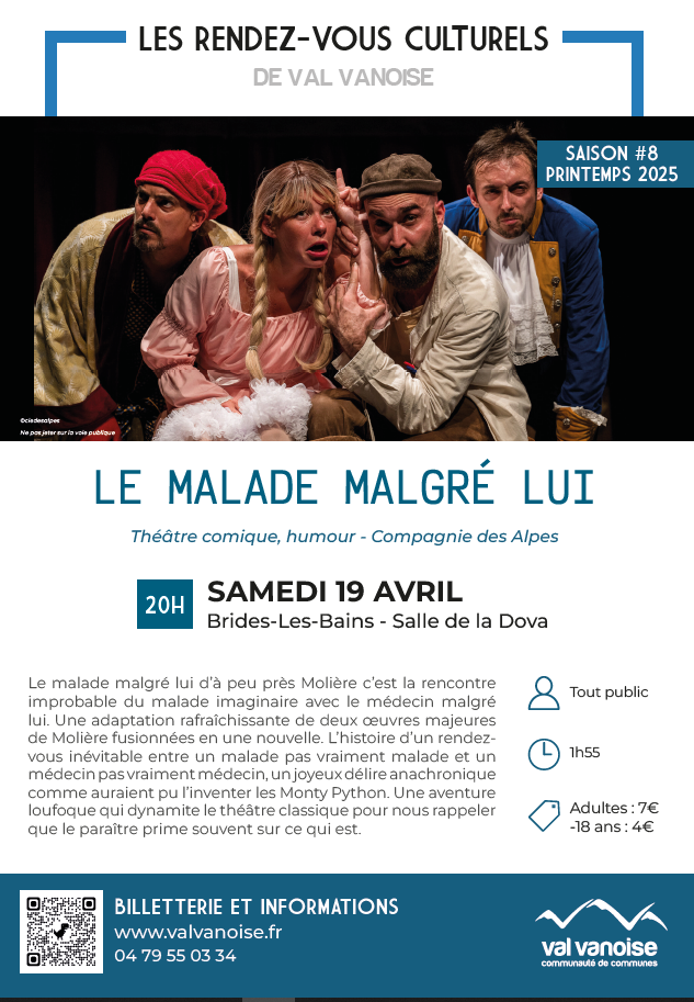 Théâtre: Le Malade Malgré Lui 4/15/25 Samedi 19 avril 2025 à 20h Salle de la Dova Tout public Durée : 1h55 Adultes : 7€ / -18 ans : 4€ :👉 réserver votre place