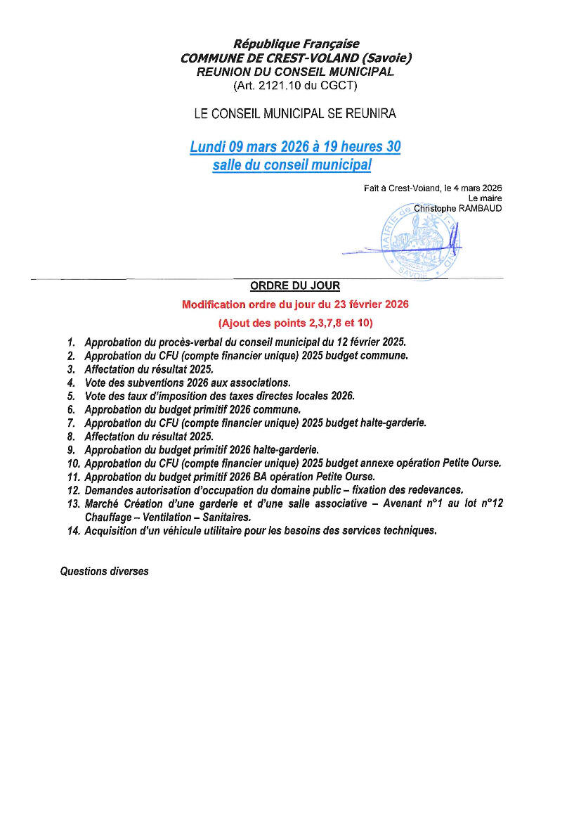 Ordre du jour Conseil Municipal du 09.03.2026