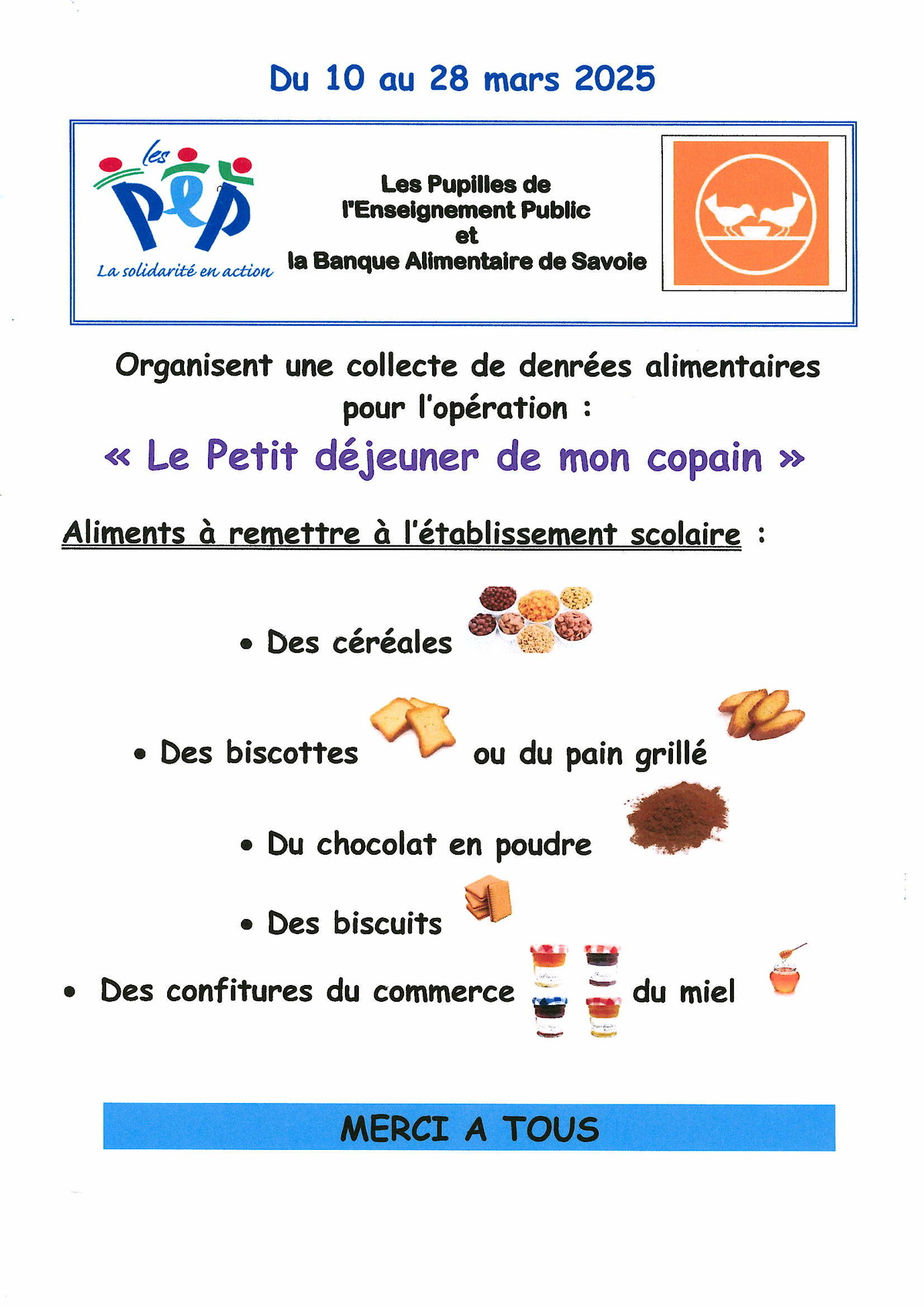 Opération "Le Petit déjeuner de mon copain" 3/24/25 Collecte de denrées alimentaires à l'école Du Planet Source : Commune nouvelle de Saint François Longchamp