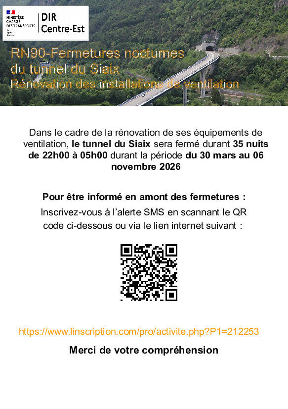 Dans le cadre de travaux de maintenance du système de ventilation, le tunnel du Siaix sera fermé 35 nuits de 22h à 05h durant la période du 30 mars au 6 novembre 2026.