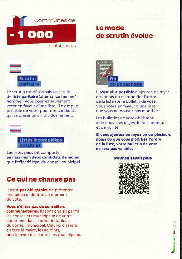Dans les communes de moins de 1 000 habitants, lors des précédents scrutins municipaux, vous aviez la possibilité de modifier la liste pour laquelle vous souhaitiez voter. Désormais, dans les communes de moins de 1 000 habitants, lors des élections municipales, il sera appliqué le même mode de scrutin que dans les autres villes. Il s’agit d’un scrutin de liste proportionnel et paritaire, à 2 tours.