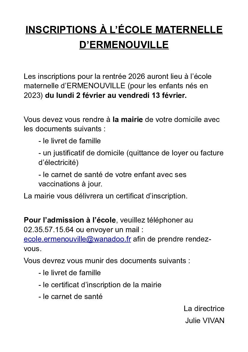 INSCRIPTIONS À L'ÉCOLE MATERNELLE D'ERMENOUVILLE