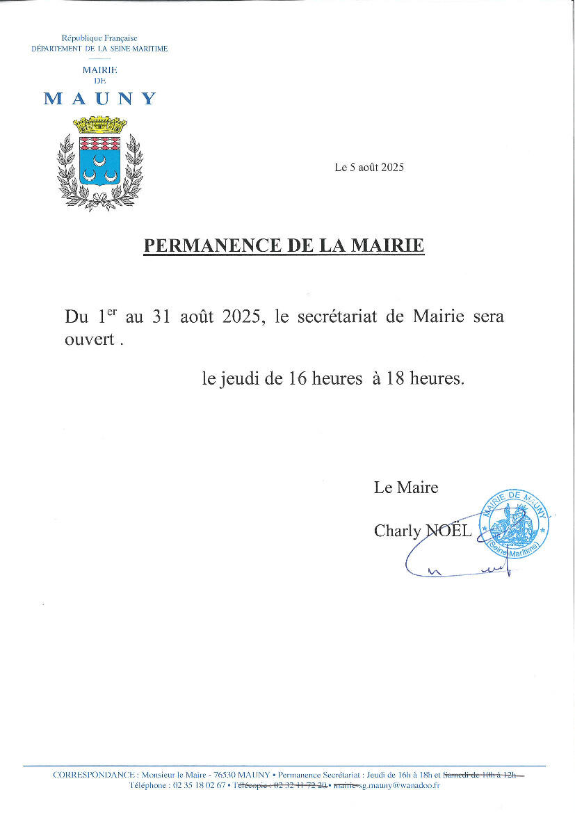 Horaires d'ouverture de la MAIRIE DE MAUNY