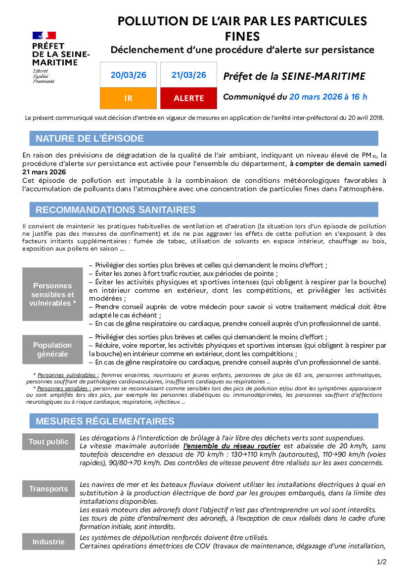 Compte tenu des niveaux de pollution mesurés par ATMO NORMANDIE, M Jean-Benoît ALBERTINI, préfet de la Seine-Maritime, préfet de la région Normandie, a déclenché, pour la journée du 21 mars 2026, la procédure d'alerte sur persistance pour une pollution de l’air par les particules en suspension (PM10).
