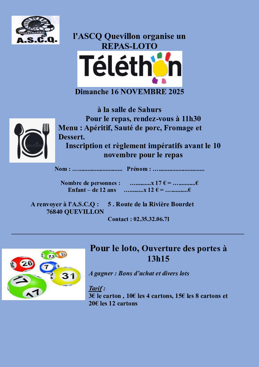 ASCQ - Repas loto au profit du Téléthon le 22 novembre