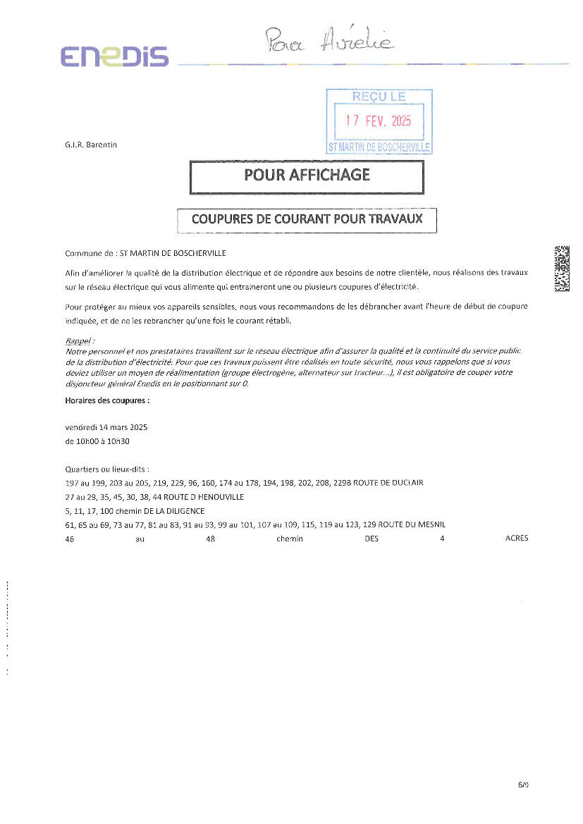Des travaux seront réalisés par ENEDIS sur notre commune le vendredi 14 mars.