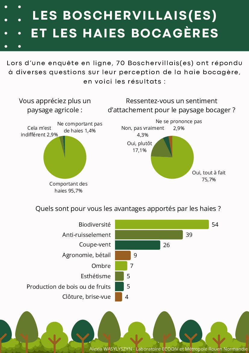 Une étude gratuite menée en 2024 en collaboration entre ECODIV et la Métropole Rouen Normandie a interrogé les habitant(e)s de Saint Martin de Boscherville sur leur rapport à la haie bocagère.